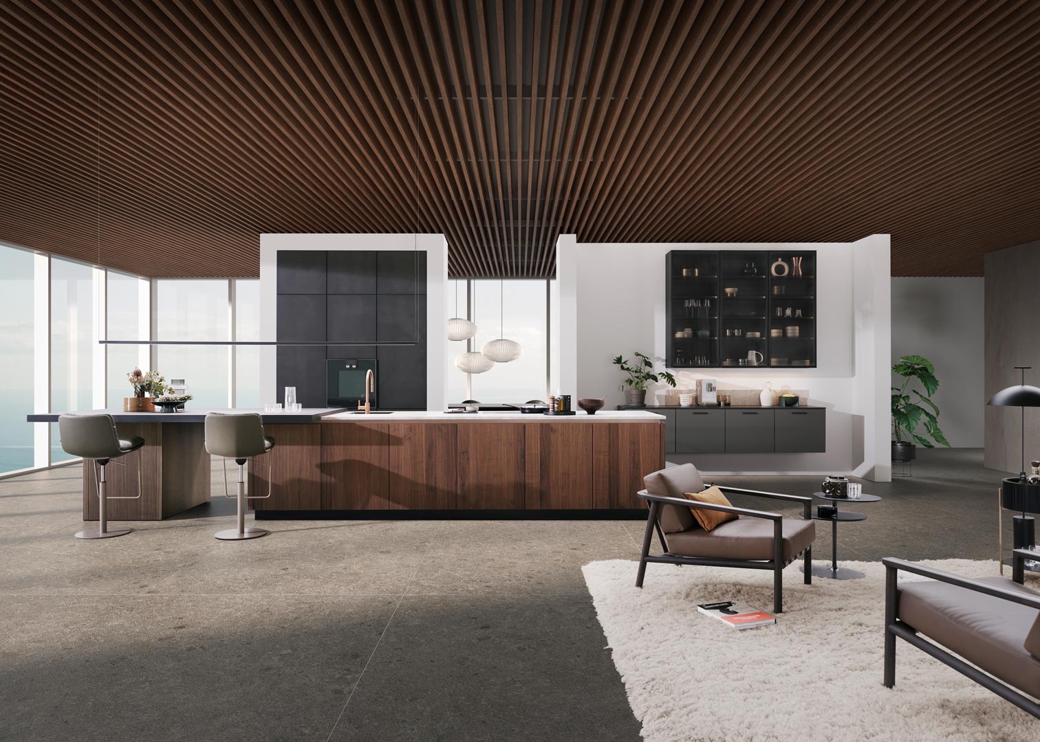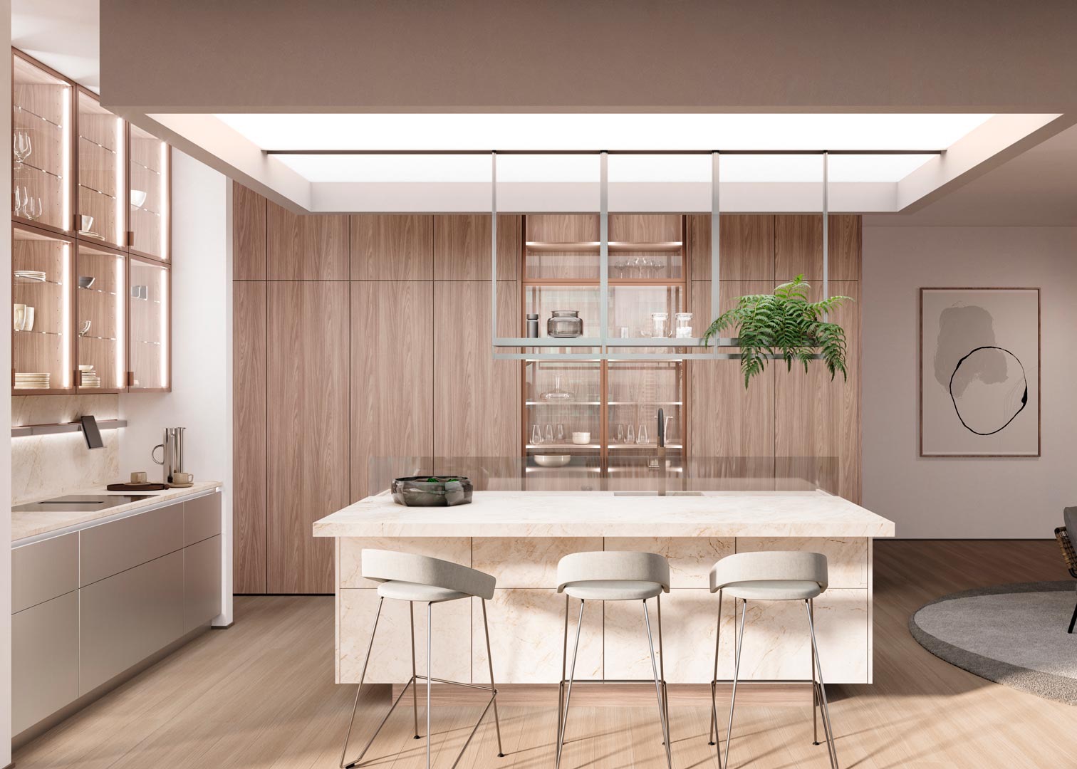 Revestimiento continuo de la cocina sin tiradores con BOSSA en nogal, para un diseño moderno y sofisticado.