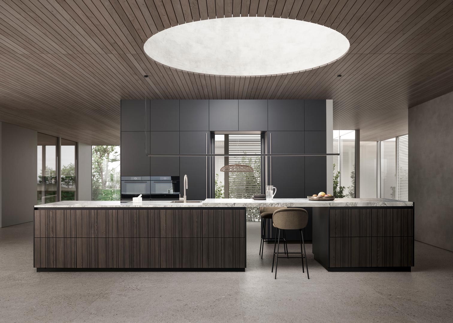 Una combinación elegante de madera texturizada y concreto, ideal para cocinas modernas de inspiración arquitectónica.